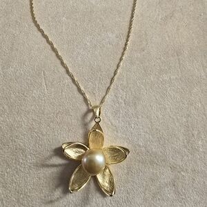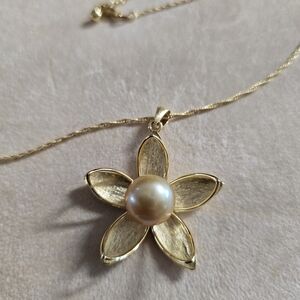 Golden Cultured South Sea Pearl Flower Pendant Necklace, 18k yellow gold Over Sterling Silver Elegant gold flower pendant necklace with a pearl centerpiece. Perfect for adding a touch of sophistication to any outfit.