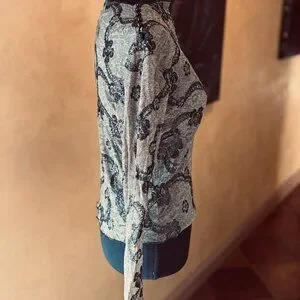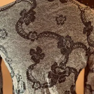 Turn heads in this rare, vintage 1990s Newport News sheer black lace floral top—an absolute gem from the era of bold glamour. Crafted in a soft, stretchy mesh with delicate floral scrollwork, this semi-sheer top features eye-catching tonal black glitter detailing throughout and dainty button accents at the shoulder.