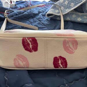 Chic and stylish, this Coach crossbody bag features a playful kiss print on a white background. Perfect for adding a touch of fun to any outfit.