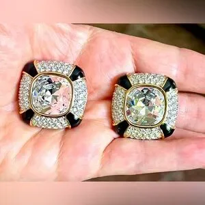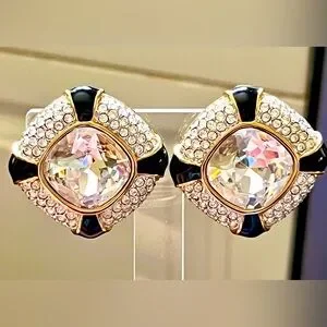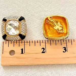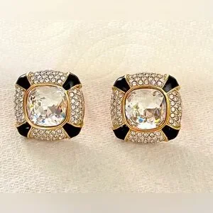 Swarovski Large Gold Plate Clip on Earrings Blk Enamel, Clear Crystal