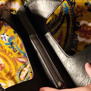 Stylish patchwork faux leather handbag featuring a blend of black, cream, and tan colors. Perfect for adding a unique touch to any outfit.
