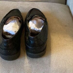 There is an area where the leather shows wear on the side of the left shoe - see photos for complete description.