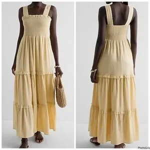 Express Square Neck Smocked Tiered Linen Maxi Dress XL Mustard