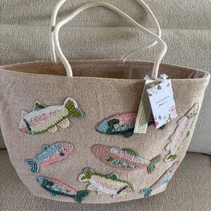 Stylish tote bag featuring colorful beaded fish. Handcrafted in India great for summer