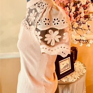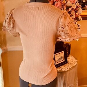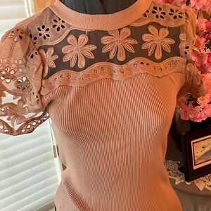 This elegant women's top features a beautiful lace floral design, perfect for adding a touch of sophistication to any outfit. The soft peach, nude color enhances its feminine appeal. Pit to pit 14 inches in length 23 inches.