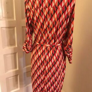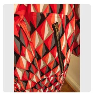Stylish dress featuring a vibrant geometric pattern. Accented with gold buttons for a chic look. Perfect for any occasion.size 14/16. Vintage geometric shift dress with snap buttons. Breast pockets and zipper pockets at the waist. Has snaps in the sleeves for adjustment, self tie belt. This item can be worn has a dress or kimono style. Stretchy fabric Slightly worn.