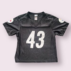 Black NFL Team Apparel Pittsburgh Steelers Women’s Jersey for Troy Polamalu #43. Has the Steelers logo on both sleeves.