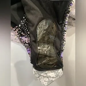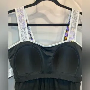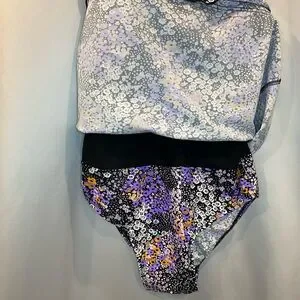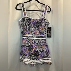 Stylish floral swimdress with strappy design. Features black, purple, and white colors.