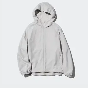 This Uniqlo windbreaker in a refreshing green shade offers a minimalist design with a full-length front zipper and a practical hood. Its elastic cuffs and water-resistant material make it ideal for light rain or wind protection, ensuring comfort and style for everyday wear.