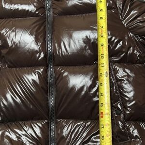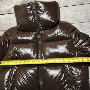 Stylish brown puffer jacket with a high collar and zip closure. Perfect for cold weather. Size 3 so M-L appropriate