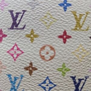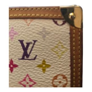 This Louis Vuitton clutch features a vibrant multicolor monogram on a cream background. Perfect for adding a pop of color to any outfit.