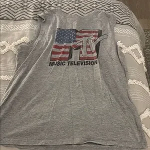 Gray sleeveless t-shirt featuring an MTV logo with an American flag design.