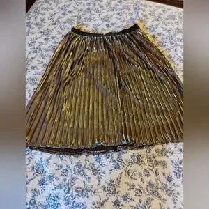 Shimmer in style with this elegant gold pleated skirt. Perfect for any occasion, this skirt adds a touch of glamour to your wardrobe.these are cute skirts to wear with Doc Martens and a cool band t shirt.