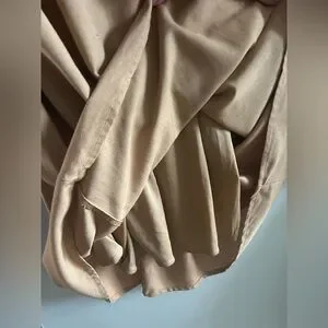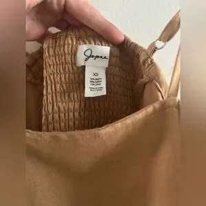 Chic tan linen blend dress with spaghetti straps. Perfect for any occasion.