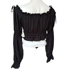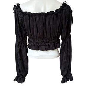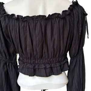 Altar’d State Black Peasant Crop Top. Can be worn on or off the shoulder. Polyester, rayon, spandex. Elastic waist and elastic at the sleeve cuffs. Tie strings at shoulders to firm a bow