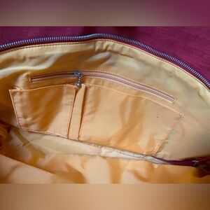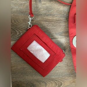 This vibrant red satchel from Baggallini combines a casual, roomy design with a touch of elegance. Its soft fabric and shiny silver hardware create a striking contrast, making it a standout accessory for any occasion.