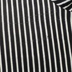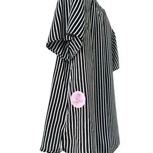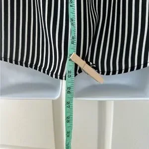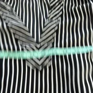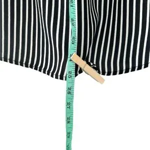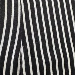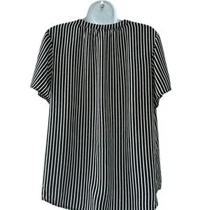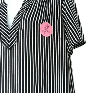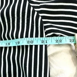 This relaxed, boxy blouse features a striking black and white striped pattern with dolman sleeves for a comfortable fit. The lightweight fabric drapes beautifully, making it ideal for both casual and business casual settings. 2 call outs for minor fabric flaws. Pink sticker shows location and close up photo shows detail.