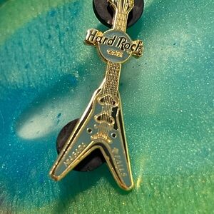 Gold guitar pin featuring Hard Rock Cafe logo. Perfect for collectors.