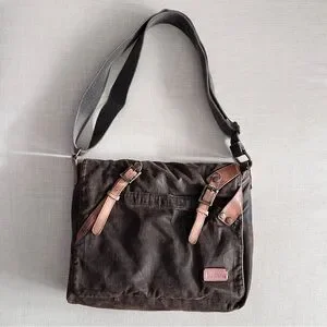 Messenger bag made of canvas with leather trim.