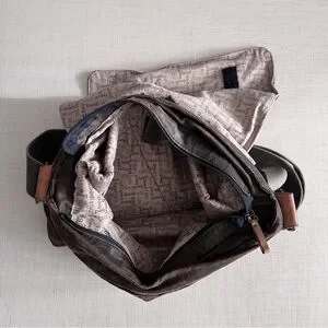 * Signature logo embossed patch and decorative strap and buckle accents.