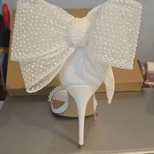 Step into elegance with these stunning white stiletto heels. Featuring a chic bow design, these shoes are perfect for any special occasion. I truly love these shoes and it was just never to be that I wore them. Brand new in original box with original stuffing. Smoke, pet and covid free home. 4 inch heel