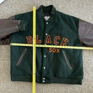 One of a kind jacket that references the 1919 black sox scandal, in which the white sox purposely lost the world series to spite their owner and profit with local bookies. This jacket is real wool, made in usa, and from the 90s. Overall good condition, only minor wear in the sleeves but not too bad at all.