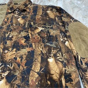 Get ready for your next hunting trip with this stylish and functional shooting shirt from North River Outfitters. This camouflage button-front shirt comes in a men's size L and features a brown all-over deer and forest print with a 3-D effect. The shirt is made from cotton and the trim is polyester, it has a medium weight, making it perfect for deer hunting in the fall.