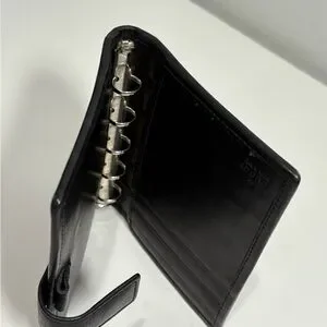 This agenda wallet is in overall very good condition showing some usage as expected. I do not see any piping exposure, but there is rubs on the stress points. The snap works well. There is a light mark on the front. There are slots for cards and the loop where the agenda goes in works well could also hold a passport.