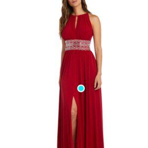 This stunning red sundress by R & M Richards is perfect for a wedding guest, featuring a sleeveless halter neckline and a flowing silhouette. The dress is elegantly designed with a silver embellished waistband, adding a touch of sophistication. Its lightweight fabric ensures a graceful drape, making it an ideal choice for cocktail occasions.