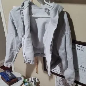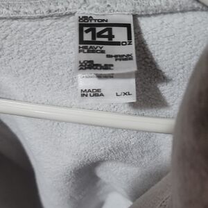Cozy gray zip-up hoodie with a hood. Perfect for casual wear. 100% cotton. from a smoke free home.