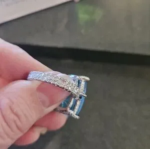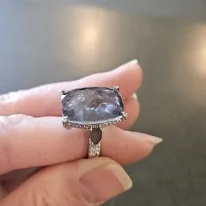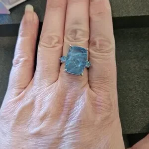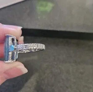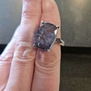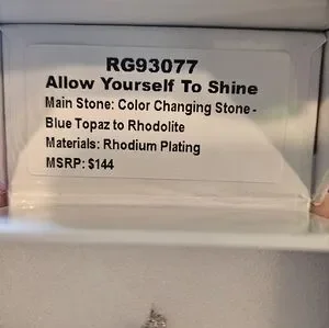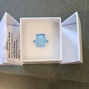 Elegant blue stone ring set in a sleek silver band. "allow yourself to shine" main stone is blue topaz and changes to rhodilite in sunlight. rhodium plating. size 8 (r)