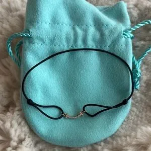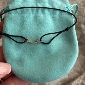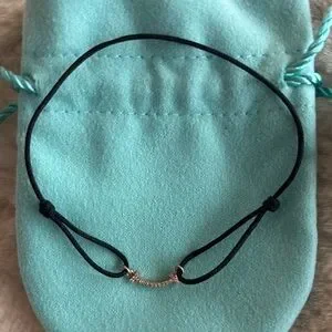 Authentic Tiffany & Co. T Smile bracelet in rose gold on a black cord with diamonds. Size Extra small-medium. Adjustable black cord. Total carat weight 0.04. Original price $990. Comes with pouch and box.