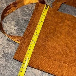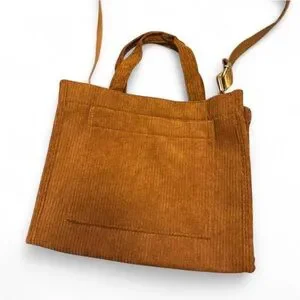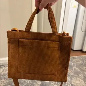 Brown corduroy crossbody handbag square tote with front pocket and adjustable shoulder strap. Brand new without tags. 10.25in x 4in x 8.5in.