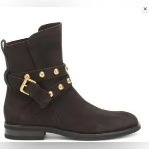 Suede Bootie In Brown Suede And Gold-Tone Hardware With Stud Embellishments And Buckle Accent