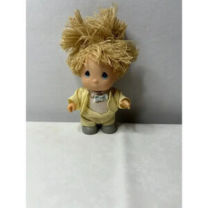 This Enesco Precious Moments Hi Babies doll is a collector's dream come true. With bendable limbs and a beautiful blue eye color, this 5-inch boy doll is a vintage piece from 1989 that will make a great addition to any collection. The doll's straight blonde hair and light complexion add to its unique beauty, making it a perfect gift for a wedding or any occasion.