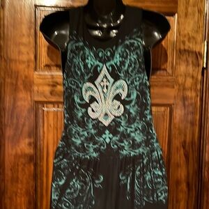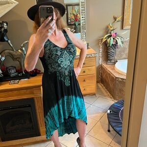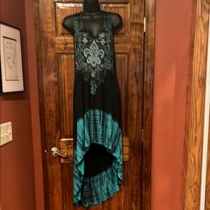 Stylish high-low dress by Vocal. Features a black top with intricate teal patterns. Flowy teal skirt with a unique design.