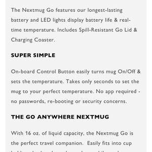 Nice condition. Used lightly and works just fine. The charging coaster and its charging cord have only been used once to test before selling, because I’ve been sharing the same charger as my Nextmug Handled mug. All components always handwashed after use. I just don’t use this mug enough to keep;)