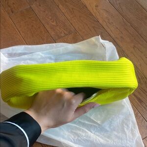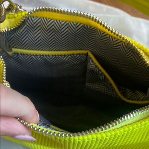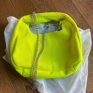This vibrant yellow shoulder bag features a textured finish and a striking metallic chain detail, making it a standout accessory. Its simple yet sporty design is perfect for casual outings, adding a bold touch to any ensemble.