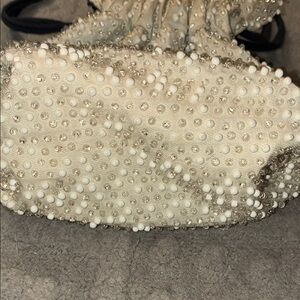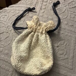 This elegant (reversible) dark navy or cream beaded drawstring bag is perfect for any occasion. Its intricate beadwork adds a touch of sophistication to your ensemble. Ideal for evening outings or special events.