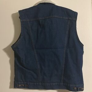 Stay stylish and warm with this blue denim vest featuring a cozy sherpa collar. Perfect for layering in cooler weather.