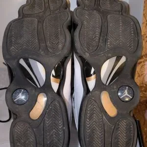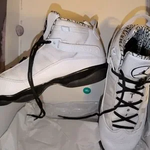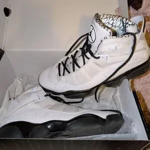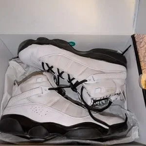 Step up your game with the Nike Jordan Men's 6 rings Sneakers. Featuring a sleek white and black design, these shoes offer both style and comfort. Perfect for any occasion. Men's size 12, worn once. great condition. not original box.
