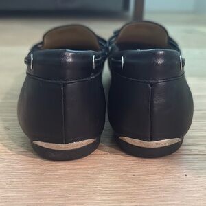 These Michael Kors flats feature a sleek black leather design with a charming bow detail on top. The slip-on style and flat sole ensure comfort for everyday wear, making them perfect for both casual and business casual settings.