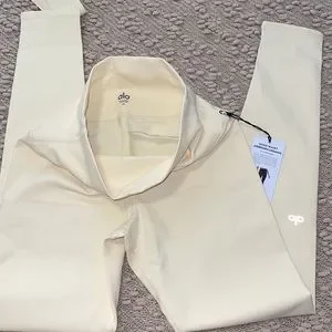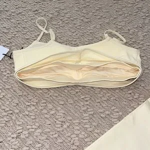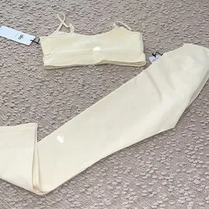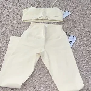 Stylish cream yoga set. Includes a crop top and leggings. Perfect for workouts.