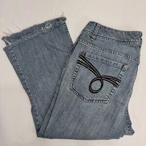 Torrid Denim cropped jeans with raw fringed hem, thick tan and black stitching and appliqué pockets. Light distressed wash, mid rise.