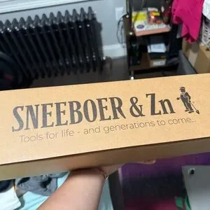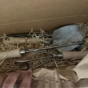 Sneeboer & Zn garden tool set in a brown box. This is the matching tool set with the Mark Cross x Aerin Garden tote. Perfect for gardening enthusiasts.