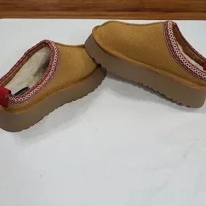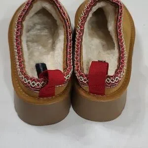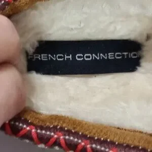 French Connection Womens Chunky Slippers Indoor/Outdoor Faux Fur Sz 7/8 EUC. Caramel brown with embroidered trim. Pre-owned, very good condition.