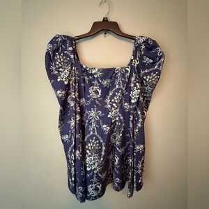 Charming mini dress by Selkie. Features a blue floral pattern. Puff sleeves add elegance.