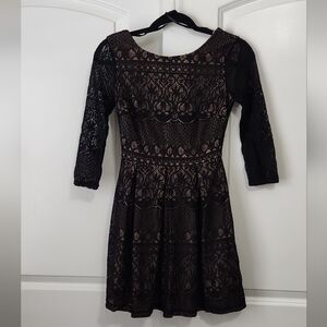 This stunning black dress by B Darlin features a classic A-line silhouette with long sleeves and a crew neck, perfect for a night out. The intricate lace overlay adds a touch of elegance, making it ideal for cocktail occasions. Its sophisticated design ensures you stand out with timeless style. **No size, but based on PtP this can fit size 0-4 womens, 1-5 (juniors), 14-18 (in girls)**