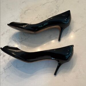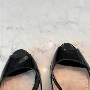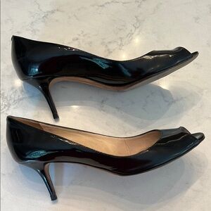 Step into elegance with these Jimmy Choo black patent leather heels, featuring a sleek peep-toe design and a classic mid heel silhouette. Perfect for any occasion, these shoes offer a polished and timeless look.