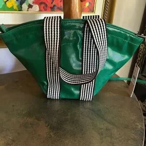 This stylish tote from Rebecca Minkoff features a vibrant green color complemented by bold black and white striped handles. Its glossy finish and medium size make it a practical yet fashionable choice for everyday use. Comes with removable crossbody strap.